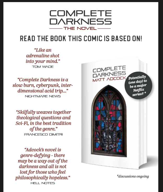 Ok, so, this is in the early phases of development, it’s still an embryo, a cool, cyberpunkish embryo, so, I invite you guys to not only get this very cool first chapter of the comic, – Out Sept 24th– but also to read THE AMAZING, hyper-sarcastic and funny book, review here, that has 4x as much story content than the comic, and really shows how cool this project is and its potential, by the same title: Complete Darkness, available now for purchase on Amazon// Author’s Page.