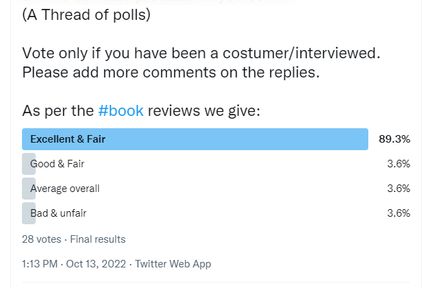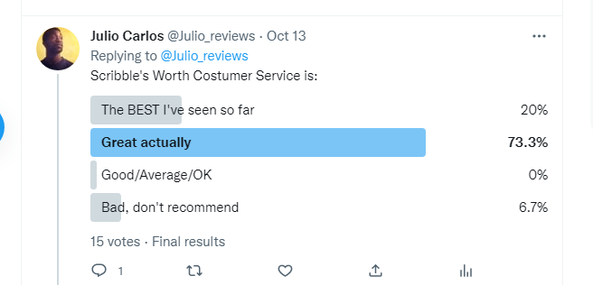 (Please mind that this was an open poll, and although, we warned people about the exclusivity of the poll, we had at least one troll voting in it. We deducted to have a troll in the poll, because we do not give negative reviews, and all reviews are approved first by the costumer, to the point that if a costumer is not satisfied, we do not post the review or charge for payment.)