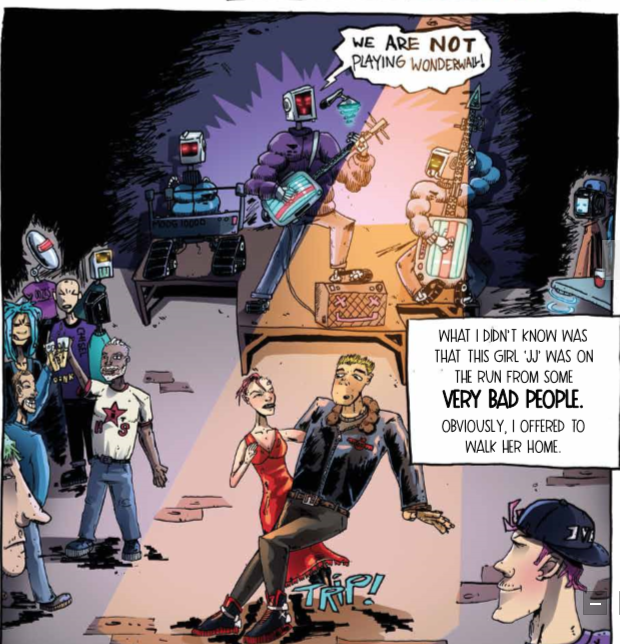 The graphics are DIRTY! (That’s a good thing). And we love it! It stays true to the Complete Darkness series, the whole atmosphere of London2, the city where this whole saga takes place, and given that this is the first time we have a full coloured comic, it matches our expectations of the scenarios where our characters would walk around.