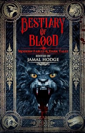 Bestiary of Blood: Modern Fables and Dark Tales grabs the eye of readers with a creep-tastic cover. This cover gives a sense of antiquity with golden borders and detailed designs that decorate the edges of this book. Each corner has a different animal holding a place there. A falcon, a tiger, a wolf and a crocodile (or alligator).
