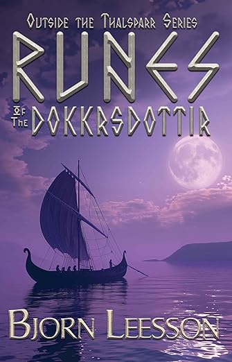 Runes of the Dokkrsdottir by Bjorn Leesson draws the eye of readers with a cover in shades of purple. The scene depicted is one of a twilight moment of the night. The moon is out, with clouds scattered across the cover, but the moon is in plain sight. In the distance, land can be seen above the horizon to the right, and shrouded in mist to the left and back. A Viking ship sits in the center of the water giving the appearance that they are sailing away from the land and into the distance.