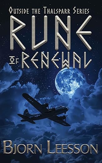 Rune of Renewal by Bjorn Leesson sets the stage with its cover decked out in blue. Set against the night sky, Rune of Renewal clues readers into the time period which this book will be taking place. In the foreground is an old-school military plane most known for its usage during the era of World War II. Behind the plane is a bank of clouds spread across the sky. The clouds give the appearance of either a storm breaking up or a storm brewing as the sky is clear behind them with the full moon rising.