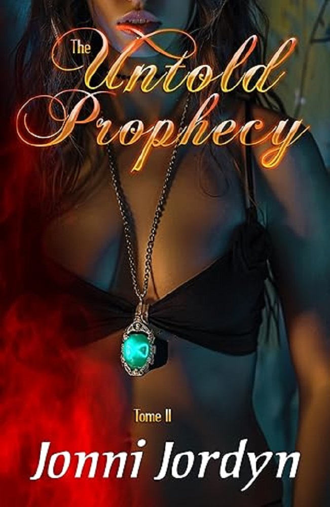 The Untold Prophecy draws the eye of readers with a cover that gives the impression of flickering flames and fire. The title itself is written in cursive script with vibrant oranges, reds, and yellows to give the illusion of it being fiery. The cover is the image of a young woman with long dark hair. Wearing a bikini-style top, she leaves little to the imagination. Hanging from her neck is a golden chain holding a glowing stone that draws the eye downward. Down to her left-hand side are flames that mildly disguise her bare midriff as the flames reach upward.