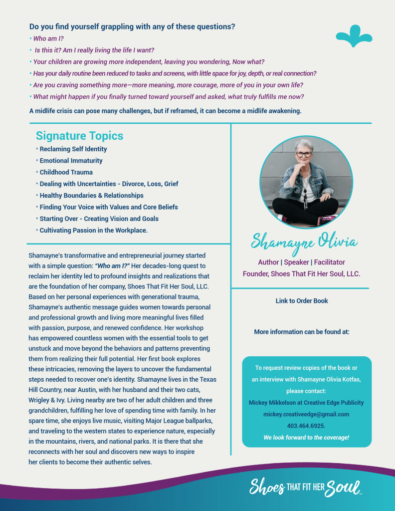 Shoes That Fit Her Soul by Shamayne Olivia Press Release Link to Order Book: ShoesThatFitHerSoul.com More Information Can be Found at: bit.ly/ShoesThatFitHerSoul Share this: Share on X (Opens in new window) X Share on Facebook (Opens in new window) Facebook Like Loading... Related Leave a comment Cancel reply Δ