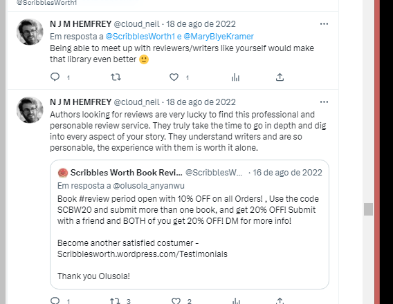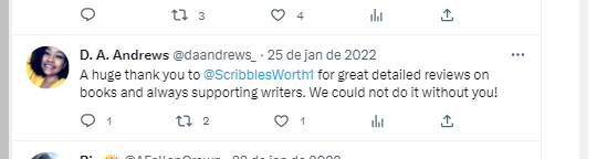 “Reviews and book promotion services by Scribble’s Worth Book Reviews are great! They show their love for reading and creative writing while remaining honest.