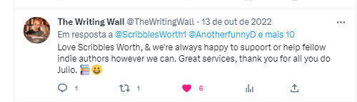 “Featured three times in Scribble’s Worth E-Mag (editions 2, 6, and 11), I’ve always found Scribble’s Worth’s Team thoughtful, courteous, and pleasant to work with. The book reviews are professional and articulate and point out the “pros” and “cons” of each work in an honest review. The author’s interview questions are thought-provoking and often unique. Scribble’s Worth offers outstanding support to authors in the Writing Community. Definitely, a service an indie author wants on their side.”
